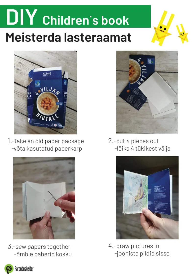 Lõika karbist vähemalt 4 lehte välja. Murra kõik pooleks ning õmble omavahel kokku. Õmblemiseks on eri tehnikaid, aga peamine on see, et lehed koos püsivad. Nüüd joonistage pildid sisse.