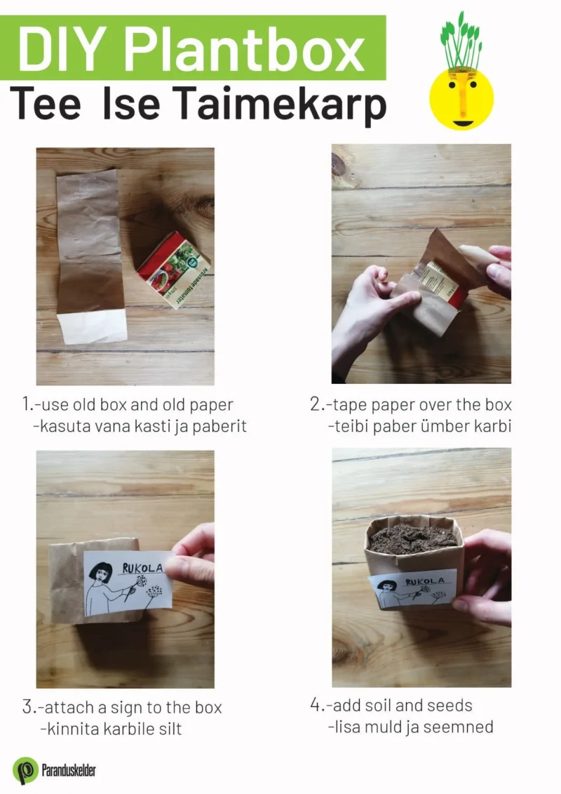 Oled märganud, et sinu prügikasti satuvad erinevad plastikust karbid ning igasugu paberiprügi tekib ka. Taimekarbi meisterdamiseks saad kasutada nii vanu karpe kui paberit. Vaja läheb ainult kääre ja teipi/liimi. Lisaks muidugi ka mulda ja seemneid. Vaata pildil olevat juhendit.